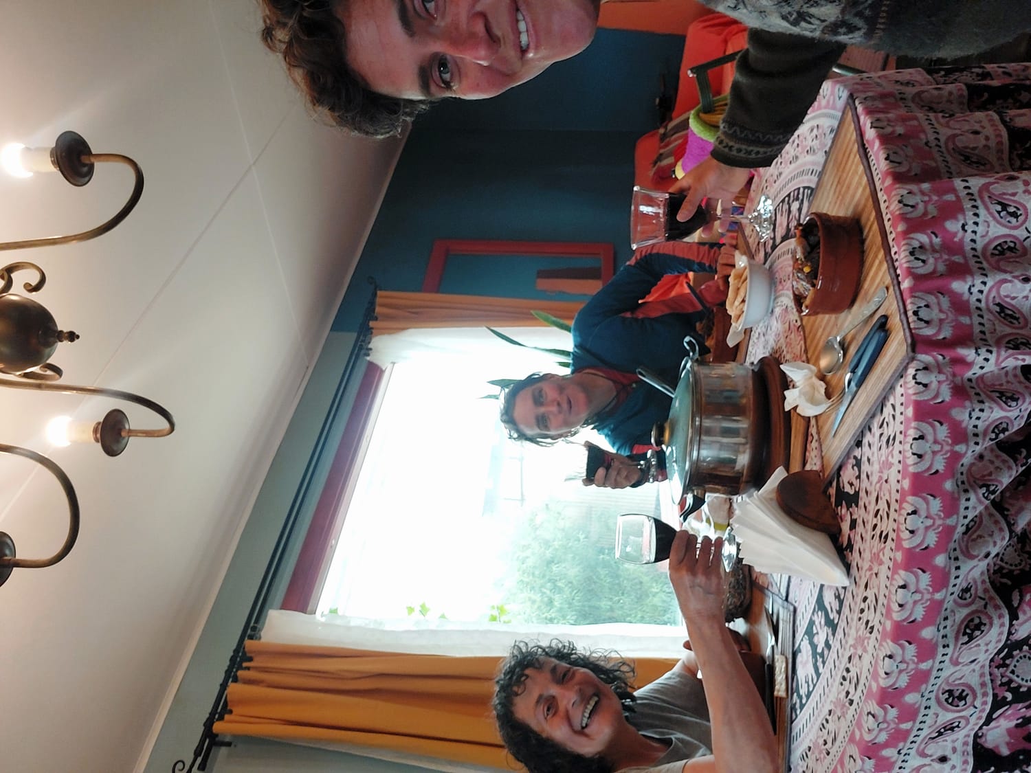 Once the tent was finally dry and we were buzzing nicely on caffeine, we loaded the bikes and then, priorities, made ham and cheese toasties. Hugo, the hostel owner, was chill, zero stress about us loitering, using the kitchen, spreading our lives everywhere. The place itself was rough around the edges, but Hugo’s generosity filled the cracks. Big heart, loose rules.