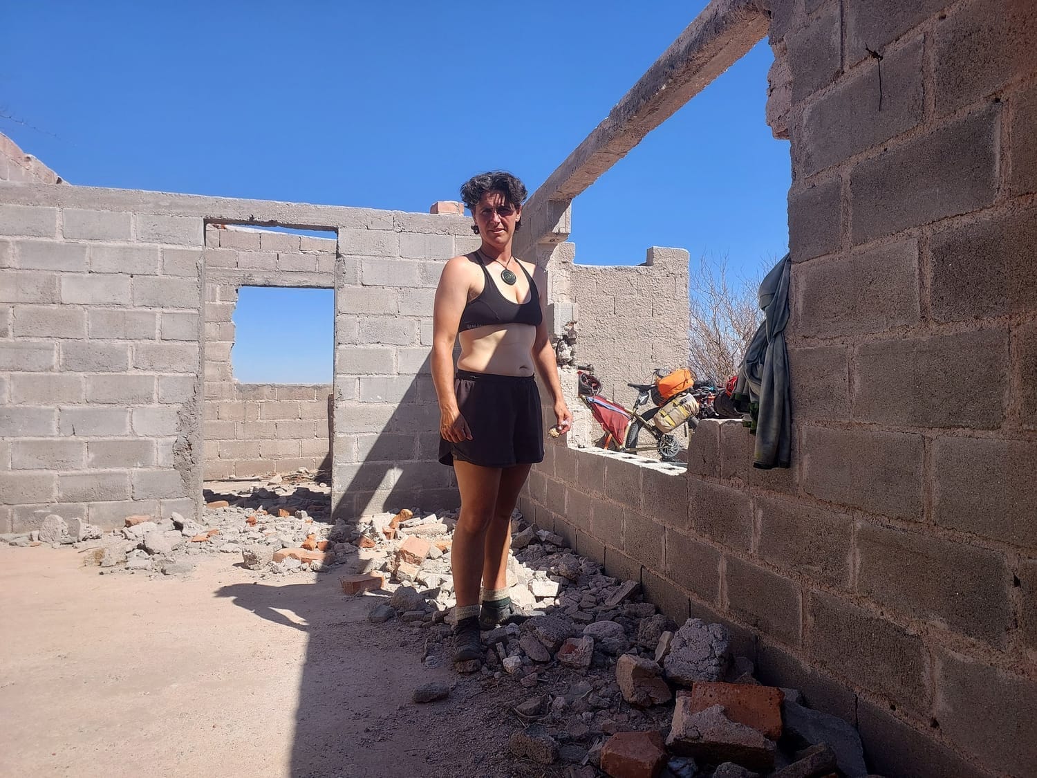 Later in the arvo, we stumbled on an old ruined house — no roof, but the walls still standing, blocking the wind, sun, and road noise. Perfect spot for the night.