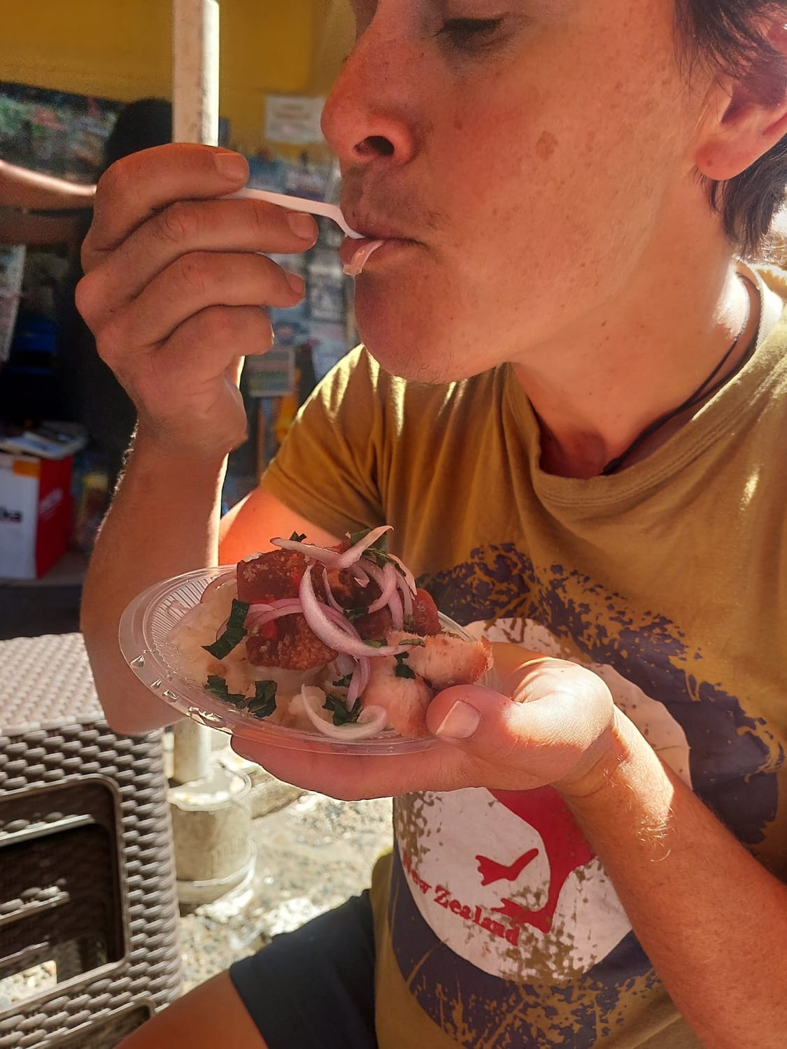 Then came the real miracle: my first actual meal since the dodgy chicken took me down. We stopped at a chicharrón cart—crispy pork heaven—and it hit like soul food.