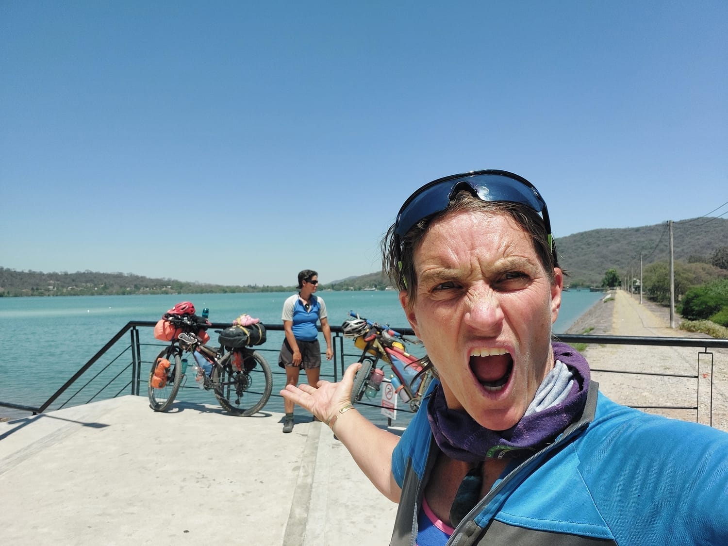 As the day went on, the heat ramped up, hotter than anything we’ve felt since Colombia. We rolled past this massive lake, both of us grinning like kids. “Yeees, swim time!” But nope. Big fat sign: No swimming. There is no God.