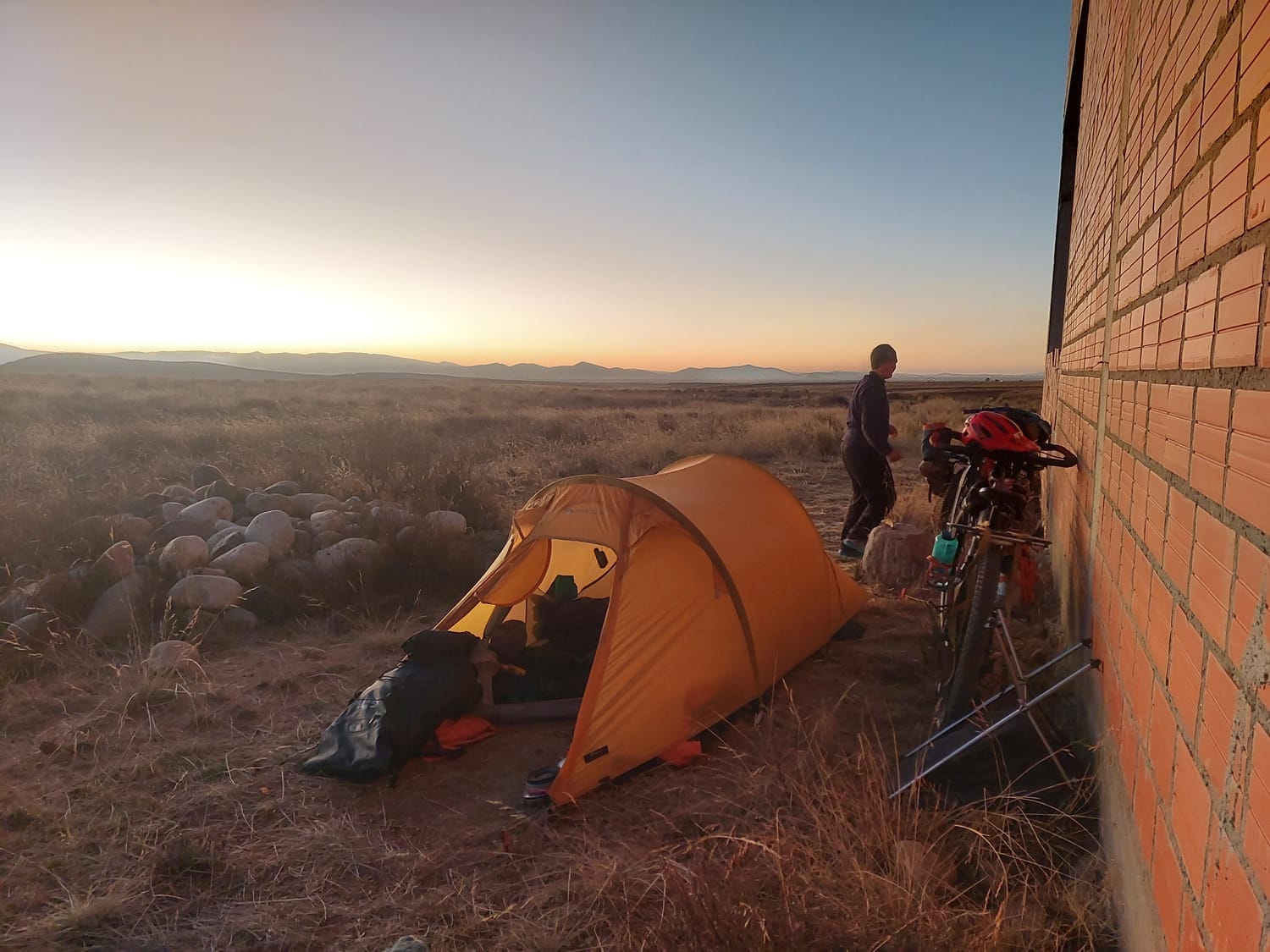 We pushed on, legs doing their best impersonation of stubborn machines, until, there it was. A row of half-finished red-brick rooms, abandoned and waiting. Lonely little boxes in the dirt. We picked the best: concrete floor, solid roof, no tent required. Luxury.