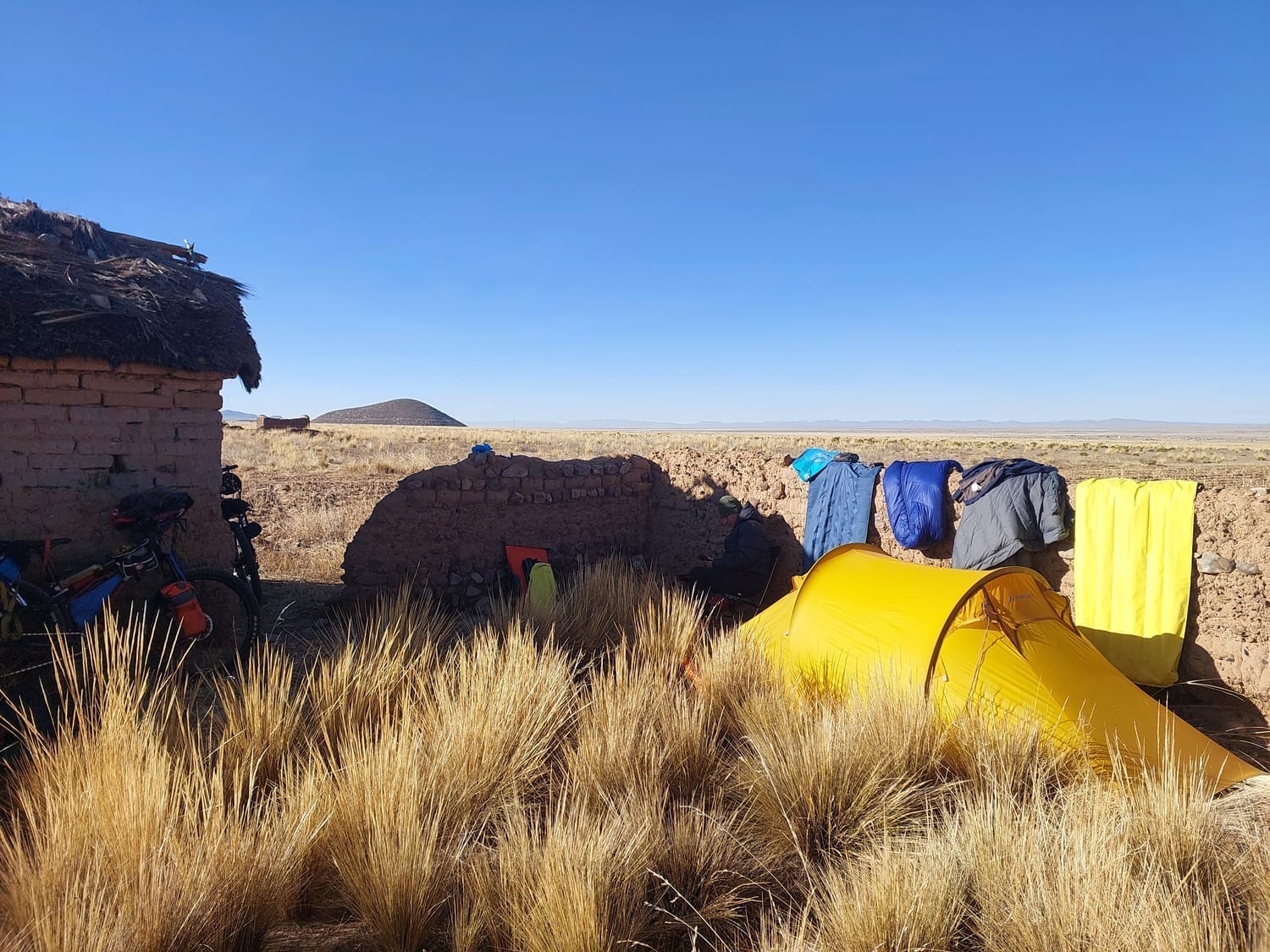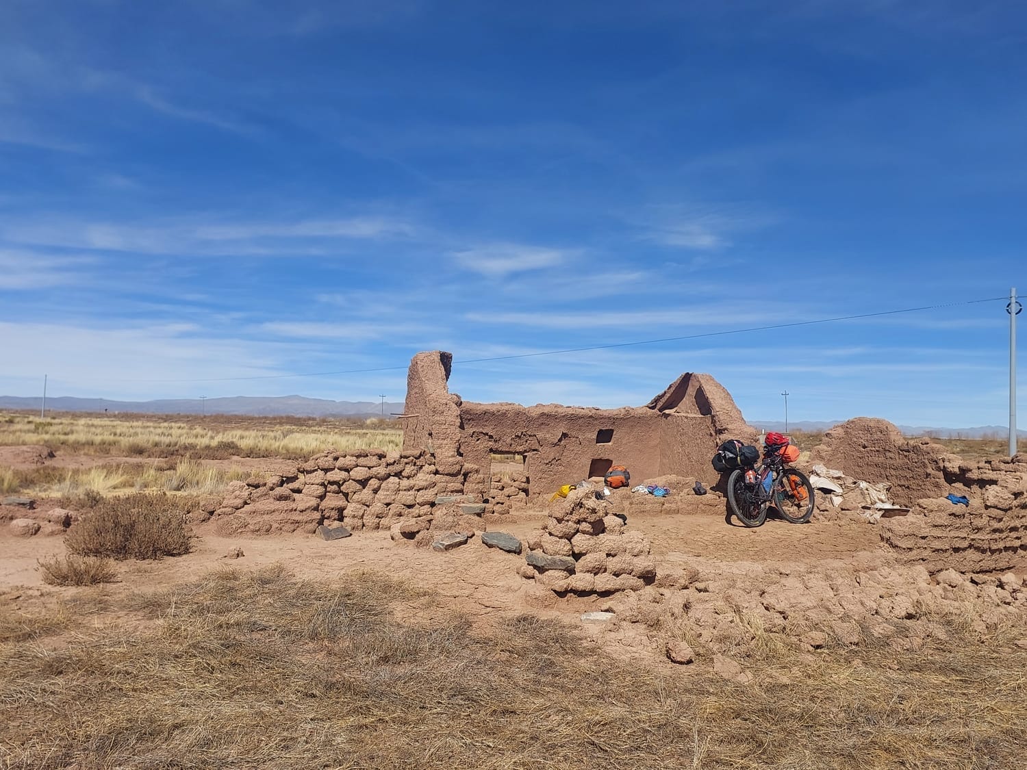 At 3pm, the ruins appeared, just a wee mud-brick shack, walls crumbled but enough to shield us from the road. Flat ground, tucked away. Perfect. Maree, being the absolute legend, rode back ten minutes to a roadside tienda for water and cervezas.