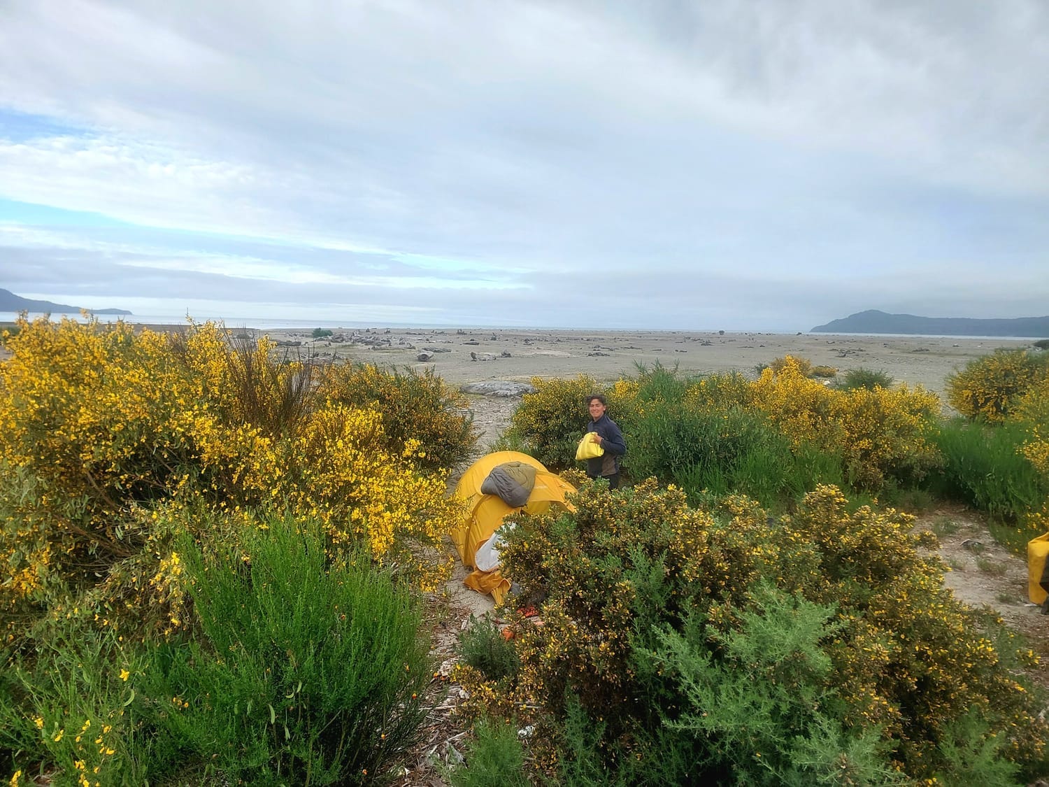 And would you believe it?? The gorse and broom became our allies. A sheltered spot right amongst them, hidden from the wind. Million-dollar views over the water. A volcano watching from the far distance like a quiet guardian. Behind us, bush-clad hills that sharply rose into hanging granite valleys and snow-capped peaks.