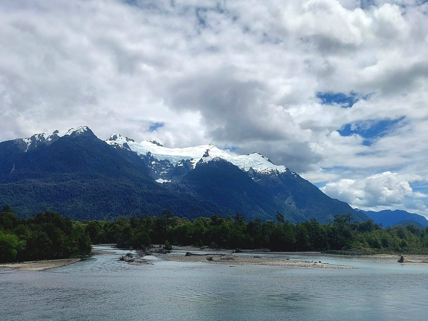 We hit the road, rolling through deep green bush with everything smelling alive after the cool night. Didn’t take long before Patagonia gave us another smack in the gob! We rounded a corner to see a massive granite mountain looming in the distance, with a glacier stuffed into its ravine like someone had wedged it there during construction.
