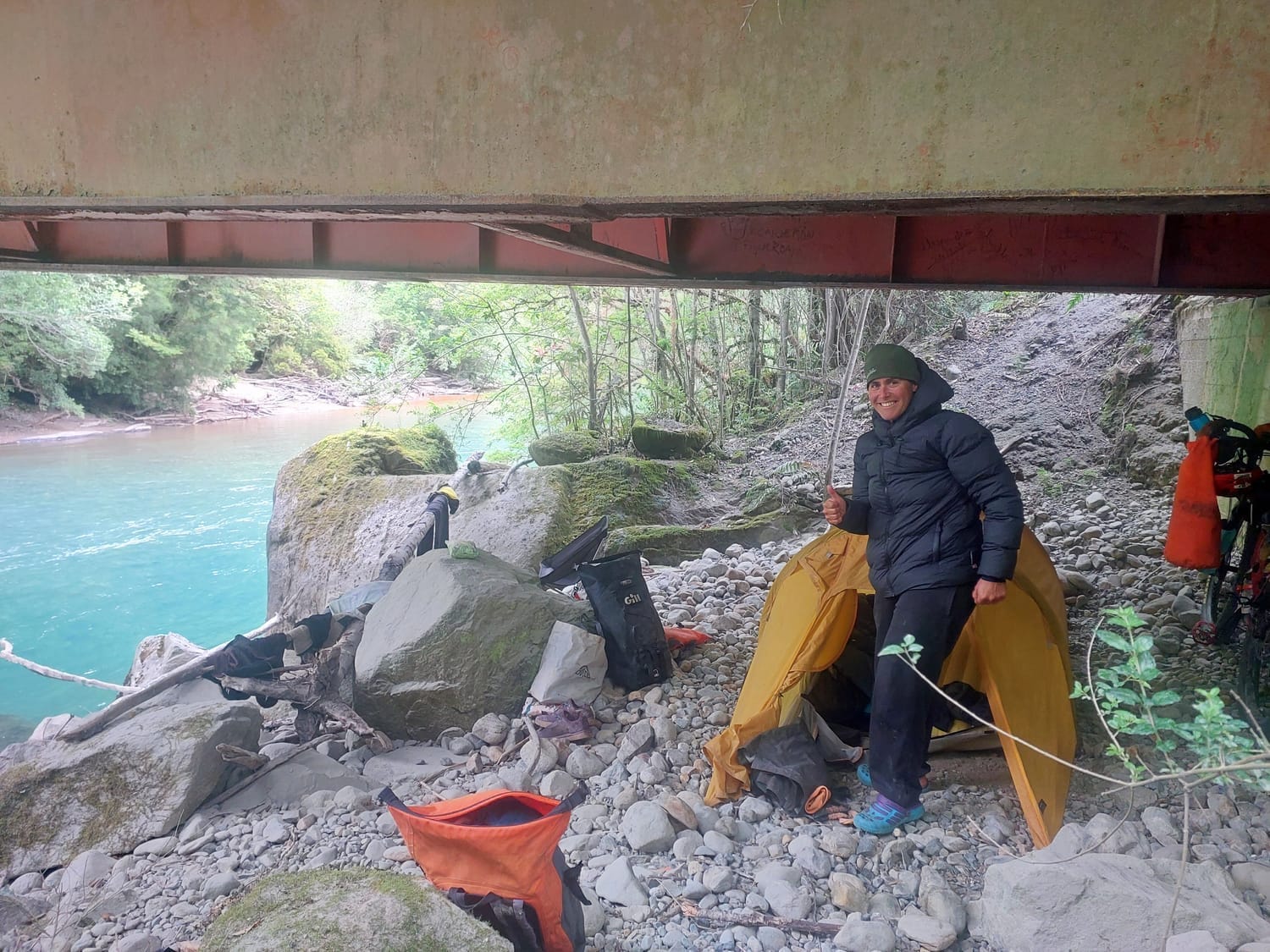 So tonight? We’re trolls under the bridge again—this one with a flat platform high off the river where the tent fits perfectly. A bit of shelter from the rain coming in. The trucks and buses will clank overhead, but they’ll fade at dark.