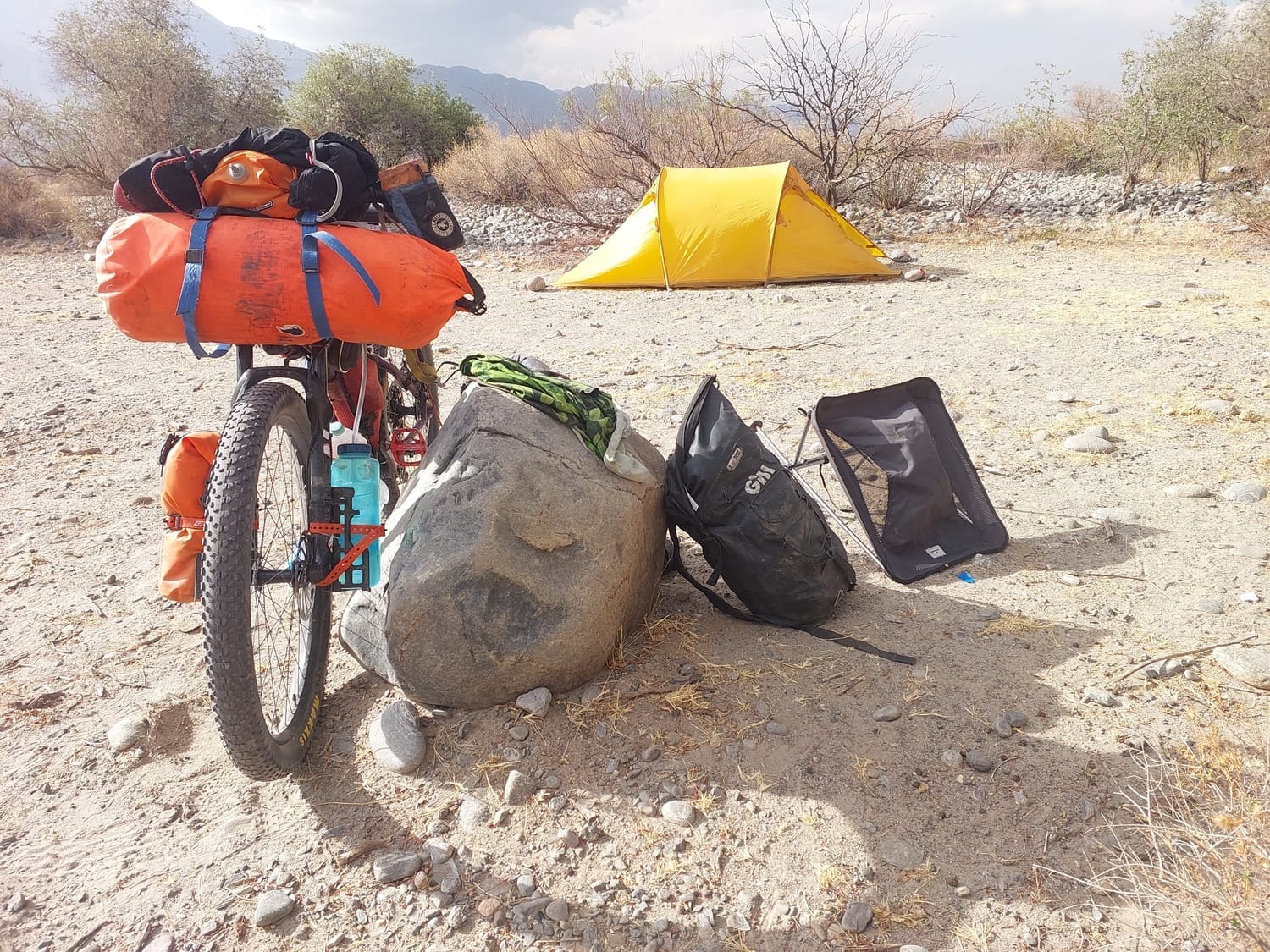 We finally found a random roadside camp, tucked beside a dry riverbed. The ground’s all gravel and dust, like we’re camping in a quarry. Off in the distance, dark clouds are brooding over the hills, real angry looking. I’m just hoping they stay put. If it rains out here, I doubt I’d sleep a wink. Feels like one good storm could send the whole valley rushing past our tent.
