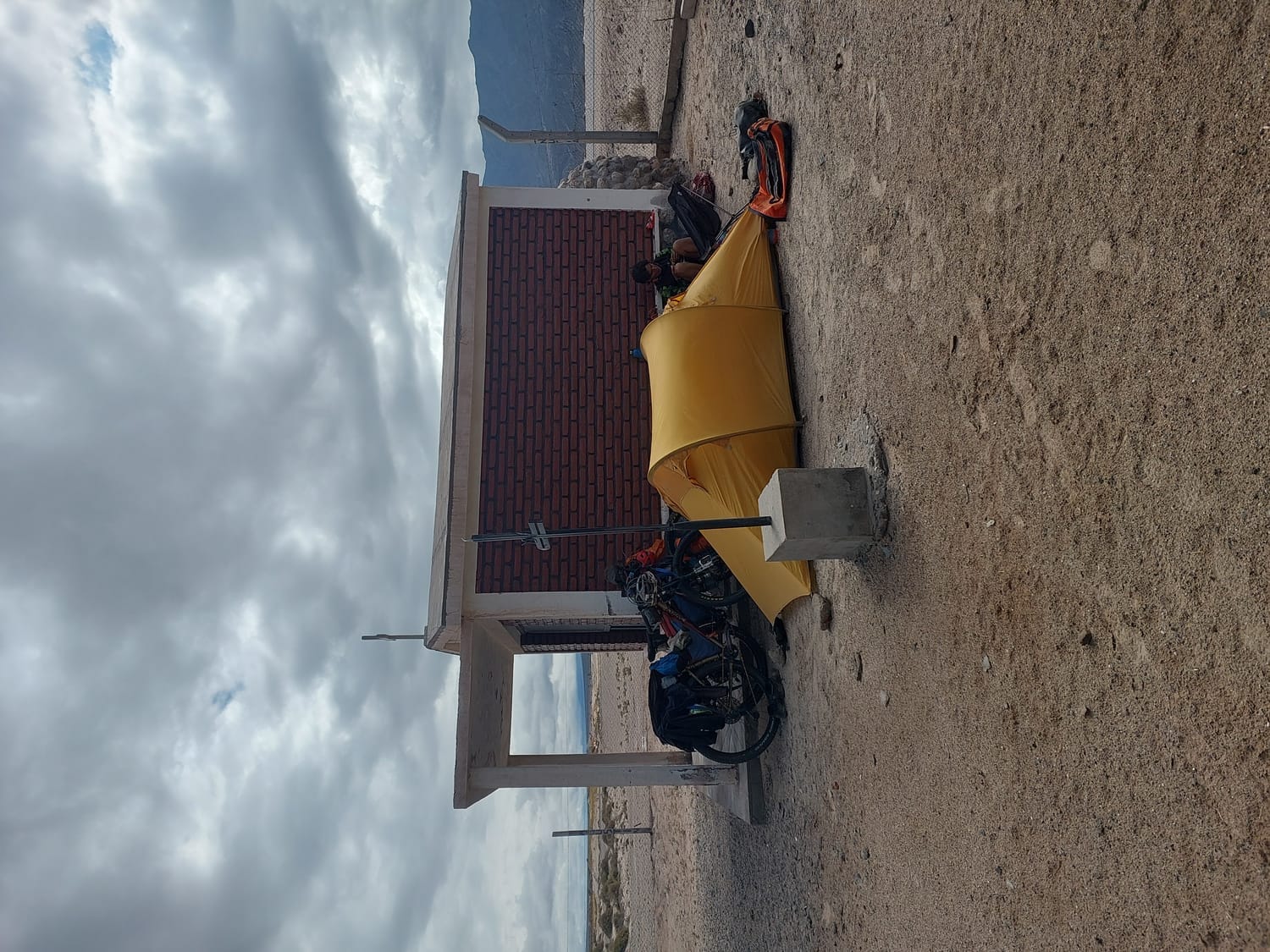 After battling through the afternoon heat and wind we’ve opted for a paid camp. This one’s more like a bachelor pad, looks like some kind of heavy vehicle operation runs out of here. There are trucks and diggers parked up, and a bunch of lads doing “lad stuff” all afternoon.